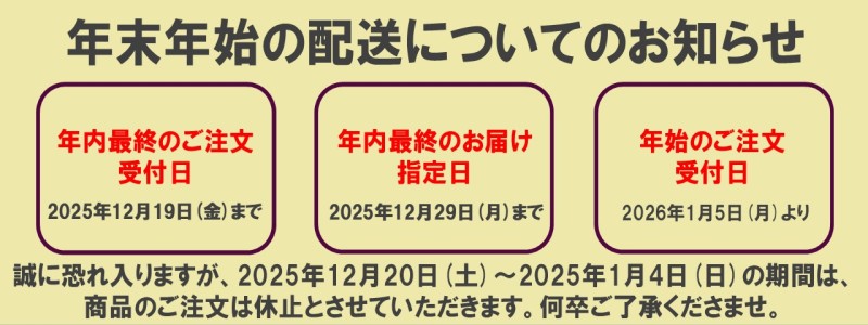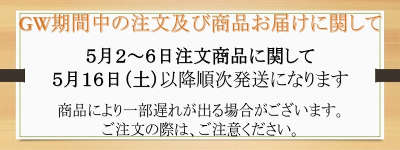- 土日・祝日や連休の休業日期間中の商品受付は、休業日明け1営業日が受注日となりますのでご了承ください。