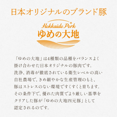 「ゆめの大地」は4種類の品種をバランスよく掛け合わせた日本オリジナルの豚肉です。