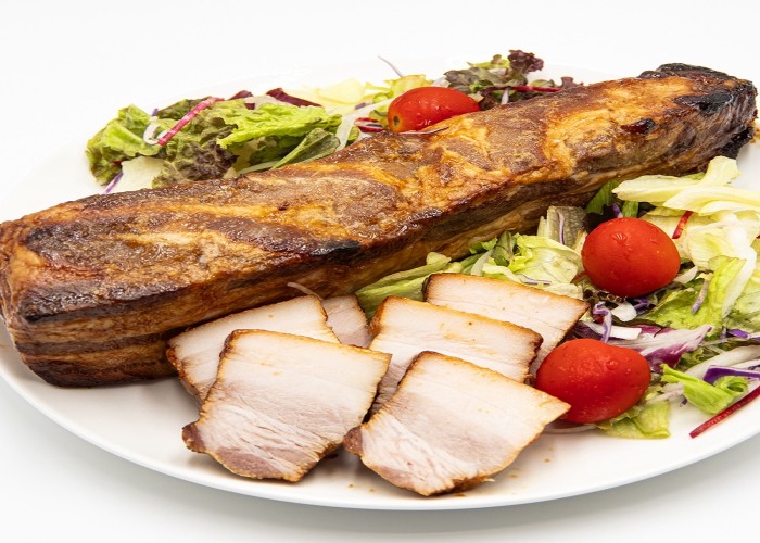 厳選した豚バラ肉を特製の「焦がし醤油だれ」にじっくり漬け込み、高温で一気に焼き上げました。