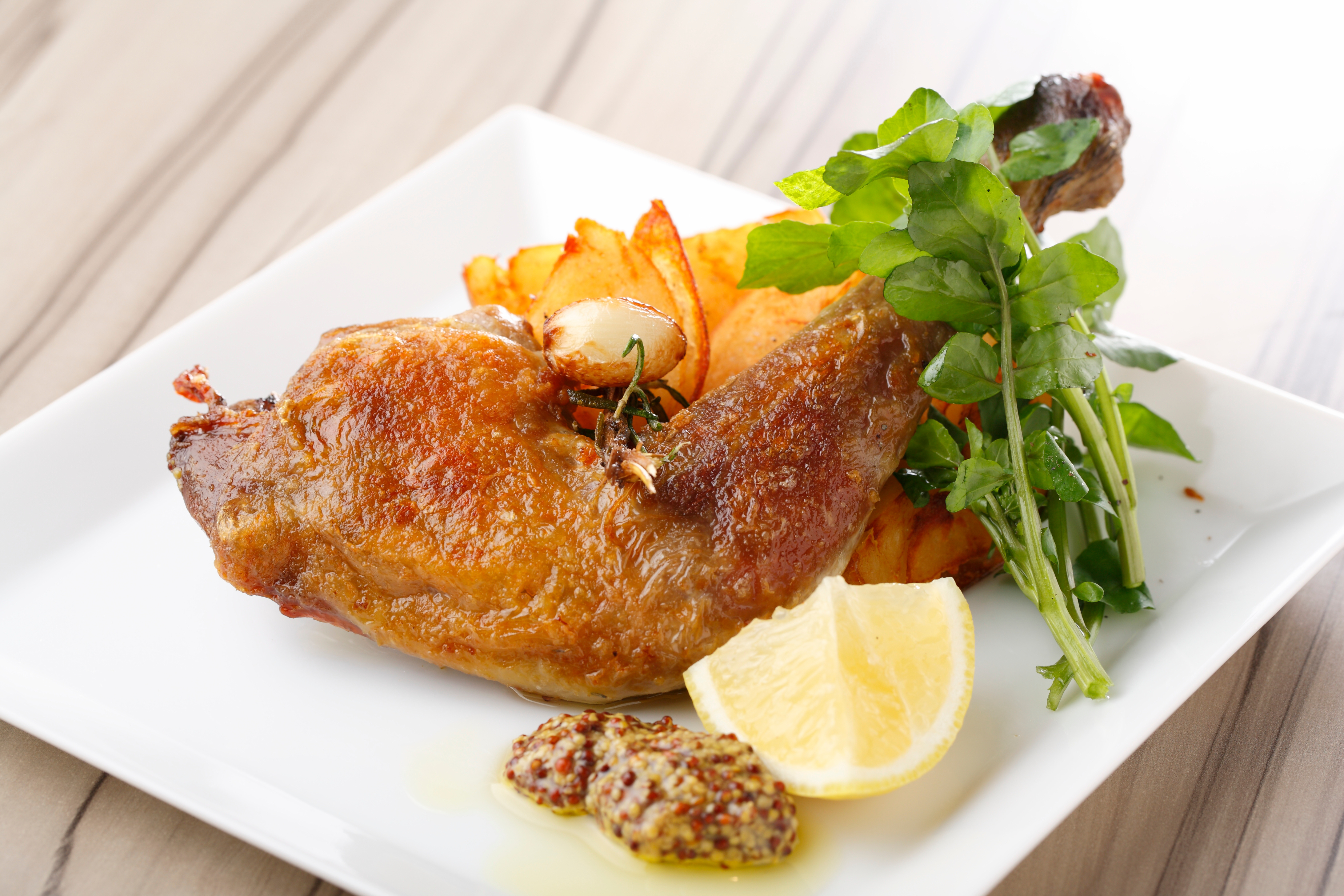 厳選された国産若鶏の骨付きモモを、上質なオリーブオイルとハーブで